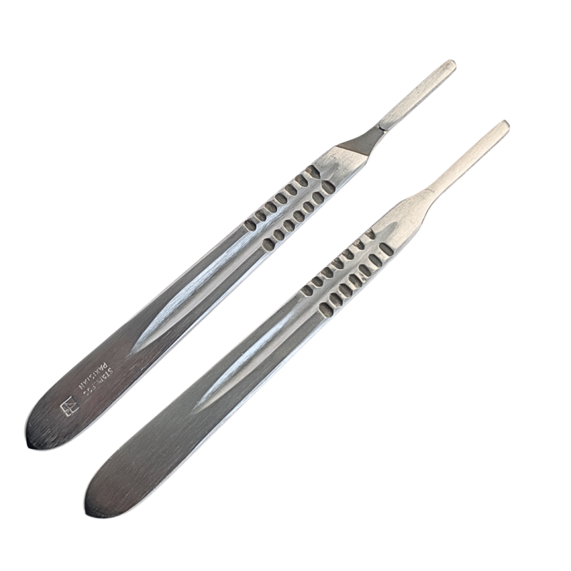 Caution: This surgical blade handle (scalpel handle) is only to be used with replaceable scalpel blades and is made of stainless steel. Please use with caution during dissections and follow proper safety protocols. Blades are not included with this handle.